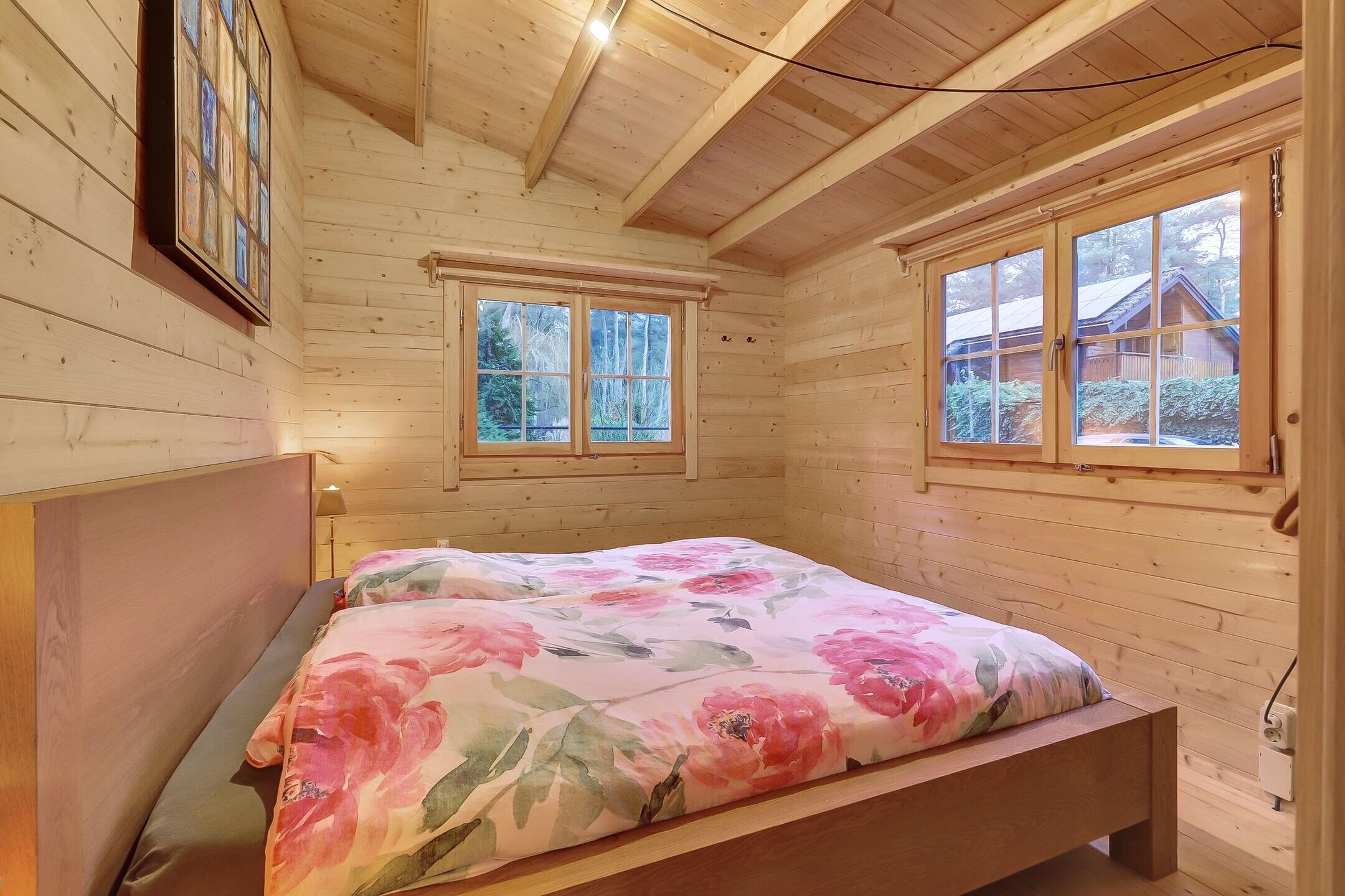 Verderop in het huis liggen twee gelijkwaardige slaapkamers, beide licht, warm en knus. De raampartijen met draaikiepvensters laten je kiezen tussen frisse lucht of volledige rust. De houten luiken aan de buitenkant geven een zacht, landelijk contrast en zorgen ervoor dat je de kamers in een oogwenk kunt verduisteren: heerlijk tijdens warme zomerdagen of juist voor een diepe, stille nacht.